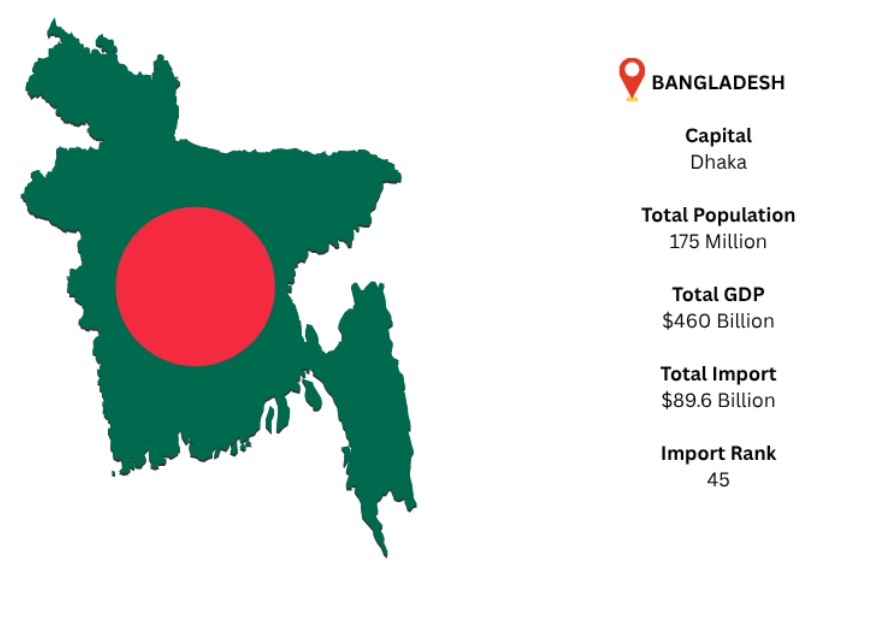 Bangladesh is a South Asian nation east of India that has borders with the Bay of Bengal on the south and India on the west, north, and east. The nation's capital and main hub for politics, culture, and the economy is Dhaka. Bangladesh's GDP is projected to reach USD 460 billion by 2024. Bangladesh is the 45th-largest importer in the world, based on recent global trade data. The biggest exporter to Bangladesh is still China. In 2024, as per Bangladesh Import Data, it is anticipated that Bangladesh's overall import value will be close to USD 89.6 billion. The product that is imported the most out of all of them is refined petroleum.