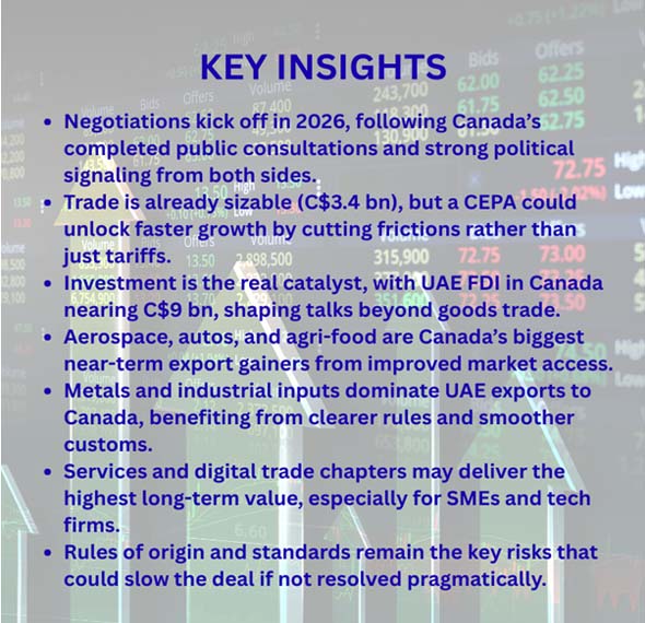 Canada and the United Arab Emirates are laying the groundwork for a Comprehensive Economic Partnership Agreement (CEPA) at a moment when both countries are actively diversifying trade relationships and strengthening investment corridors.