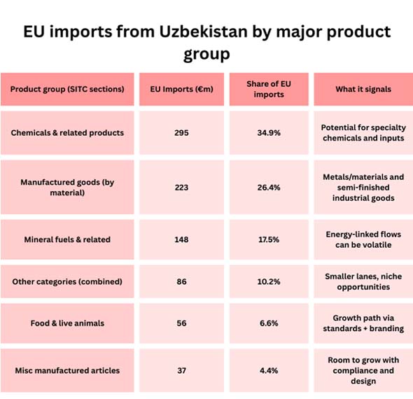 Uzbekistan's exports to the EU are still smaller and more focused, but the make-up of those exports is changing. The government wants to move up from exporting raw materials to processed agri-food, textiles with compliance credentials, and intermediate industrial goods.