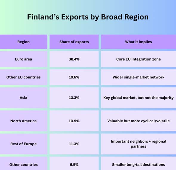 Finland is a classic “small, open economy”: it relies on international trade to sustain industrial output, employment, and investment. But Finland’s trade relationships are not evenly spread across the world.