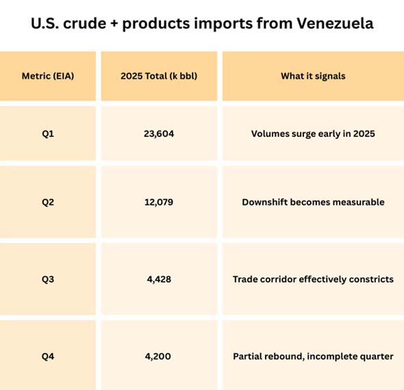 The easiest way to explain how Venezuela's oil exports to the US changed from 2025 to 2026 is that they went from being random and hard to follow in 2025 to being more deal-driven and organized in early 2026. The EIA's Import Data shows that there were robust figures at the beginning of 2025, a decline in the middle of the year, and a partial recovery. Then, in early 2026, it looks like the reopening will have a lot more trades, fewer means to pay, more traders, and the prospect of more licenses being granted out.