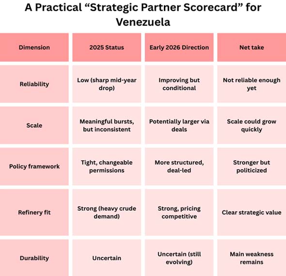 The short answer is that Venezuela is becoming a useful tactical supplier again, and by early 2026, it looks like it may be a conditional strategic partner, but only with strict policy control, transaction structures, and compliance guardrails. The relationship is getting stronger, but it's not yet secure, wide-ranging, or predictable enough to be like the old days of "normal" energy partnerships.