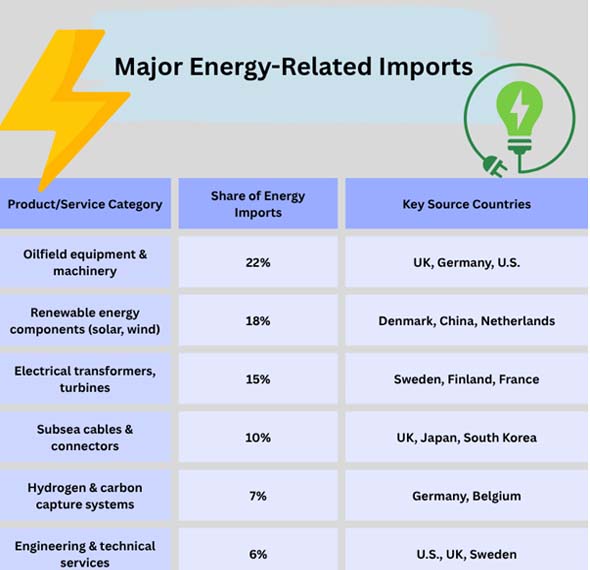 Carbon Capture and Storage (CCS): Norway is a leader in carbon capture initiatives like the Northern Lights Project because it uses technology from the Netherlands and Germany. People and businesses want smart meters, control systems, and heat pumps to help them save energy. This means that Norway buys technology to keep its green growth continuing and sells power. The maritime business needs imports and change to be strong.