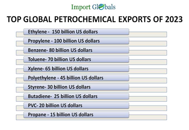 The increasing necessity of petrochemicals in different industries has led to a higher global export range. According to the Global Petrochemical Export Data, the top 10 export variants of 2023 are,