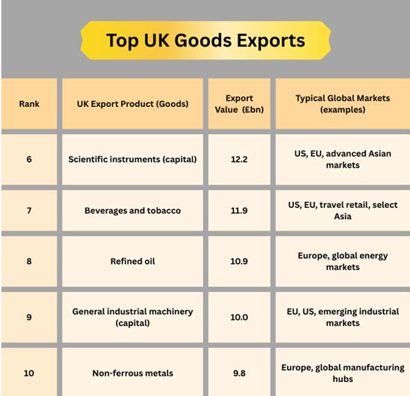 The UK's top goods exports are large and specialized, and they compete on quality, compliance, and built-in knowledge (research and development, design, and engineering).