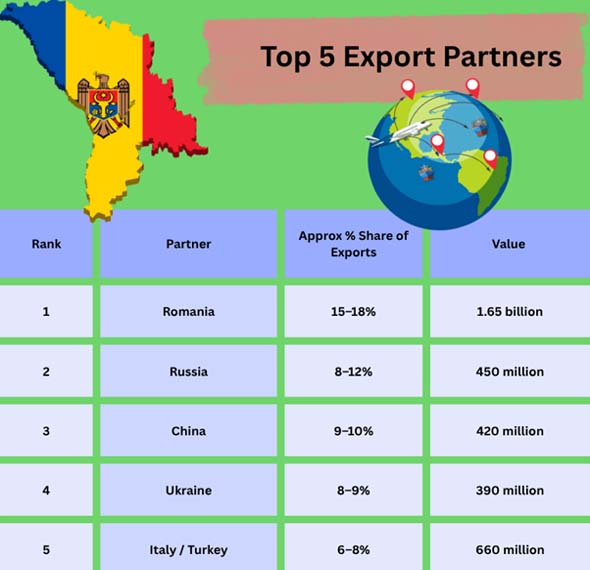 EU Share: More than two-thirds of Moldova's exports travel to the EU, and Romania is the most popular place for them to go. These data illustrate that Moldova's key export sectors are quite important and that the country is getting more connected to European trade networks.