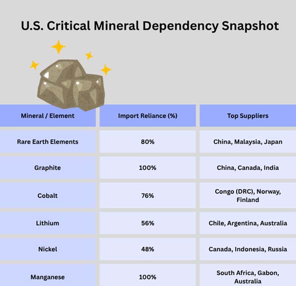 The USGS says that about 50 minerals are important for the economy and safety. By 2024, the government will have to buy all of them from other countries. As per USA Export Data by Import Globals, Manganese, graphite, niobium, and rare earth elements are some of them.