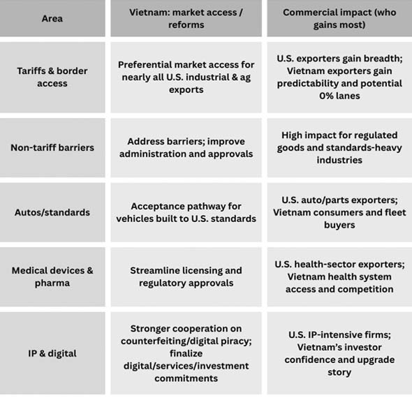 Here's a useful way to think about the deal structure: Vietnam's concessions are mostly about getting into the market and getting rid of barriers, while the U.S. side is about tariffs and a selective 0% lane.