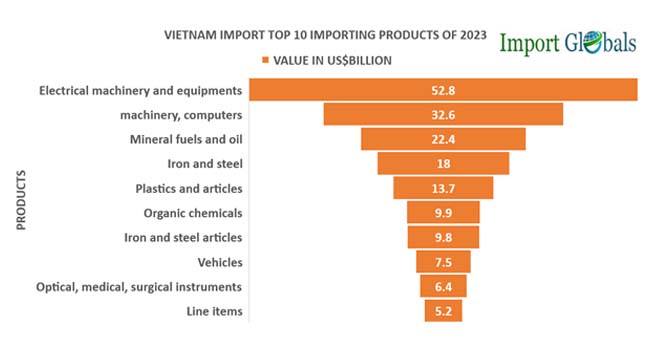 Vietnam highest importing products are electrical machinery and equipment’s with antotal import value of $52.8 billion in the latest year.