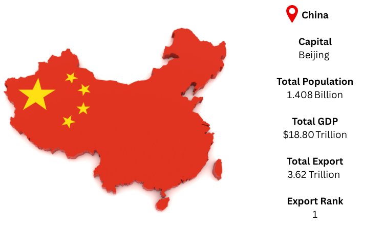China, a huge East Asian nation with the second-largest economy in the world, has its capital in Beijing. With a population of more than 1.408 billion, China's GDP reached USD 18.8 trillion in 2024, according to China export data. With a staggering total export value of USD 3.62 trillion in 2024, China topped the world in exports. Electronic integrated circuits were the nation's main export product, while the US was its top export partner.