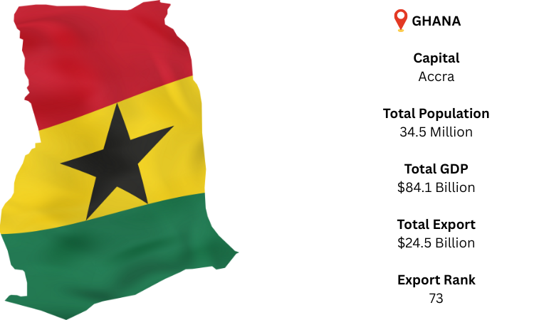 Ghana is a country in West Africa that borders Togo to the east, Burkina Faso to the north, and Côte d'Ivoire to the west. It has access to both the Atlantic Ocean and the Gulf of Guinea. Accra, the nation's capital and largest city, is a significant center for banking, trade, and government. According to Ghana export data, Ghana's GDP would expand gradually and reach USD 84.1 billion in 2024. Ghana is the 73rd greatest exporter in the world, based on global export data. According to recent trade statistics, China is now Ghana's largest importer. Ghana's overall export value is anticipated to reach USD 24.5 billion in 2024.
