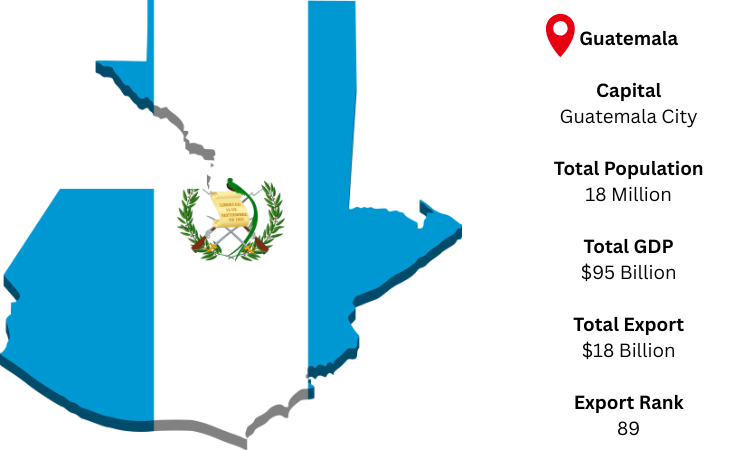 Located in Central America and bordered by Mexico, Honduras, El Salvador, and the Pacific Ocean, Guatemala is a major regional exporter of agricultural products and textiles. Its capital is Guatemala City, and its economy benefits from trade ties with the United States, neighboring Central American countries, and Europe. According to Guatemala export data, Guatemala ranked 84th globally, exporting goods worth USD 18.9 billion. It has a GDP of USD 112 billion and a population of 18.69 million.