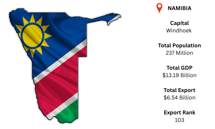 Namibia is a country in southwest Africa that shares borders with South Africa, Botswana, Zambia, and Angola. It also has an Atlantic Ocean coastline. Windhoek is its largest city and capital. Namibia's GDP was at USD 13.19 billion in 2024. The nation contributes around 0.2% of the world's total export volume, placing it about 118th in the world. In 2024, as per the Namibia export data, Namibia's overall export value was around USD 6,540 million. About 40.9% of exports, or USD 2,240 million, are made up of pearls, precious stones, and metals, particularly diamonds (HS 71). China, South Africa, and Botswana are Namibia's biggest export markets as per Namibia Export Data.