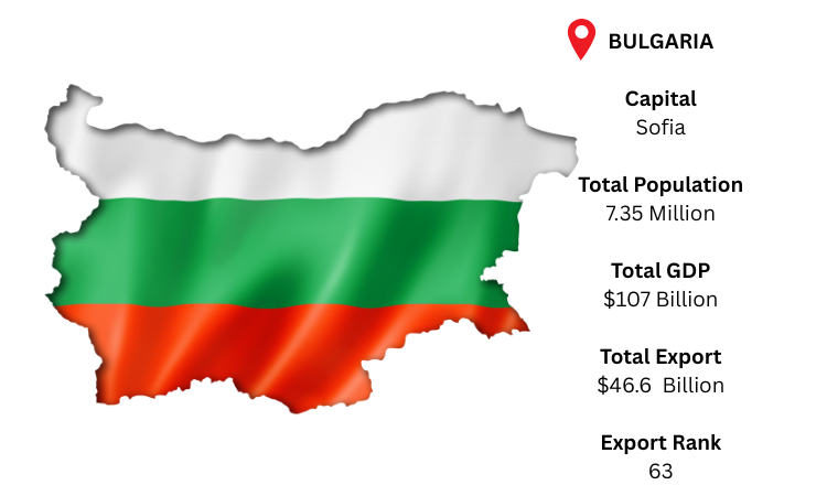 The economy of the Southeast European nation of Bulgaria is becoming more and more tech-driven and industrialized. Sofia, the capital, serves as the hub for both the national government and business. It has a GDP of USD 107 billion and a population of around 7.35 million. As per Bulgaria export data, with total exports of about USD 46.6 billion in 2024, Bulgaria is ranked about 63rd in the world; yet, it has a trade imbalance due to increased imports. With electrical-electronic equipment at the top of its export range, Germany, Romania, and Italy are its major export destinations.