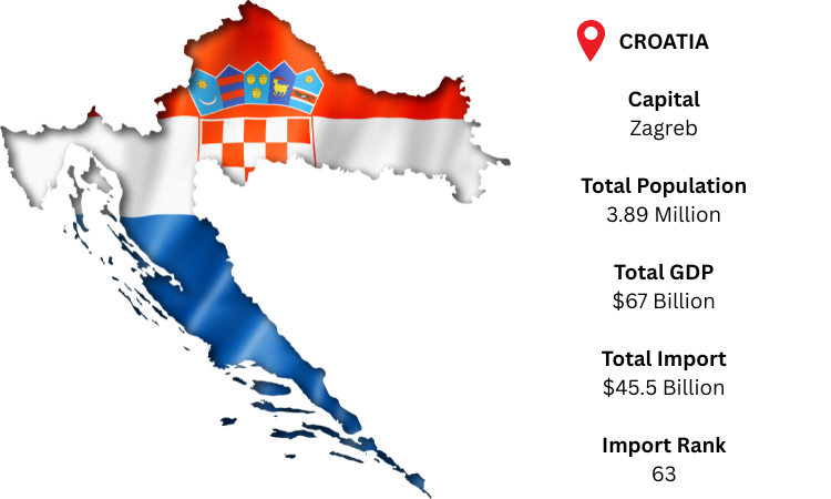 Croatia, a nation in Southeast Europe and an EU member, is well-known for its tourism, coastal trade, and developing industrial sector. Zagreb, the capital, is the political and economic center of the nation. As per Croatia import data, Croatia, which has a population of around 3.89 million and a GDP of roughly USD 67 billion (2024 est.), came in at number 63 in the world for imports in 2024, with a total import value of USD 45.5 billion. Italy, Germany, and Slovenia are its primary import partners, and its top import category is still mineral fuels and oils, which are essential for the transportation and energy industries.